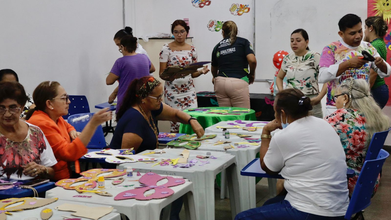 Na manhã desta terça-feira (10/02), o Centro Estadual de Convivência da Família Maria de Miranda Leão, situado no bairro Alvorada, juntou os integrantes dos Grupos de Convivência “Mas Ativo” e “Estimulando a Memória” numa Oficina de Carnaval para confecção de máscaras, utilizando papelão e EVA, usado para revestir, decorar e dar acabamento ao look festivo.