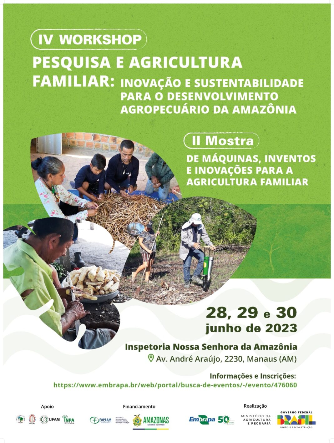 Começa nesta quarta-feira (28/06), a quarta edição do Workshop Pesquisa e Agricultura Familiar e II Mostra de Máquinas, Inventos e Inovações para a Agricultura Familiar. O evento conta com o apoio do Governo do Amazonas, por meio da Fundação de Amparo à Pesquisa do Estado do Amazonas (Fapeam), e segue até sexta-feira (30/06), das 8h às 18h, de forma gratuita, na Inspetoria Nossa Senhora da Amazônia, localizada na Avenida André Araújo, Petrópolis, zona sul.