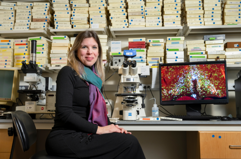 Natália Machado em seu laboratório na Escola de Medicina de Harvard (foto: Anna Olivella/ Harvard Brain Science Initiative)