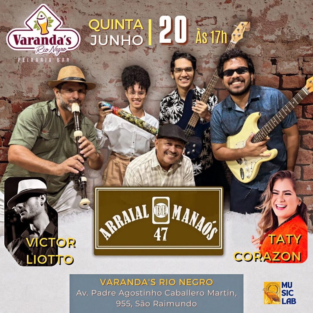 Canções do Norte, passando pelas toadas de boi bumbá, até os sons latinos como a cumbia, vão embalar o repertório da banda Arraial de Manaós, que se apresenta na próxima quinta, 20 de junho, às 17h, no Varanda’s Rio Negro. O show, que traz uma mistura de ritmos dançantes, terá a participação dos cantores Taty Corazon e Victor Liotto. O couver artístico custa R$5.