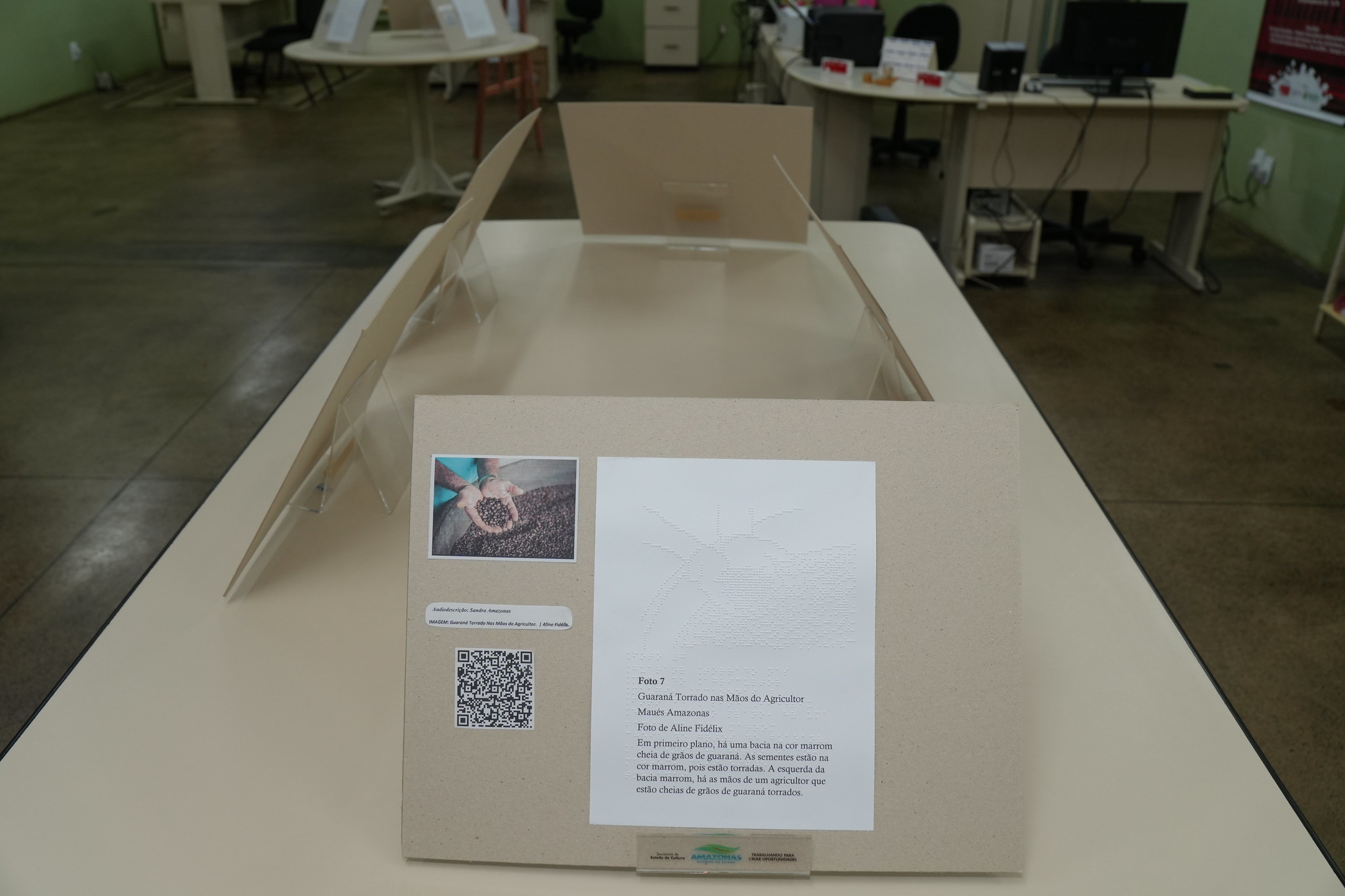 Cada obra pôde ser vista, tocada e ouvida. As imagens, originalmente não acessíveis, foram adaptadas pela equipe da Biblioteca Braille com versões táteis das fotos, legendas em tinta e em braille, além de QR Codes com audiodescrição. O resultado foi uma experiência completa e inclusiva, que permitiu às pessoas com deficiência visual conhecer e sentir as paisagens, os rostos e os símbolos do guaraná amazônico.