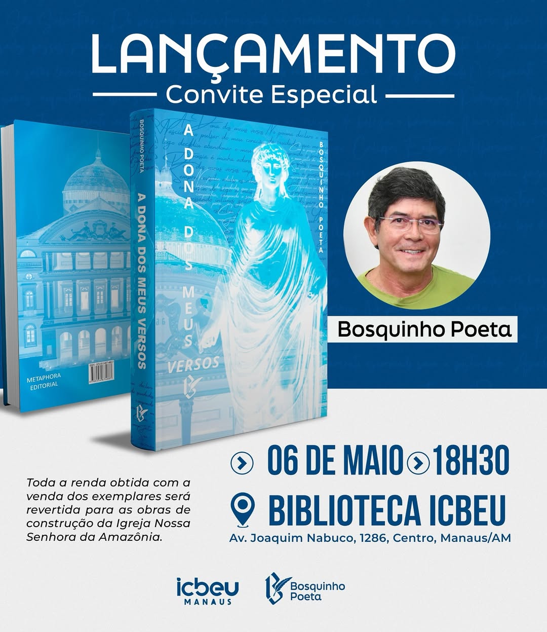 No próximo dia 6 de maio de 2025, às 19h, a Biblioteca do Teatro ICBEU, em Manaus, será palco do lançamento de ‘A Dona dos Meus Versos’, novo livro do poeta amazonense Bosquinho Poeta. A entrada é gratuita e o evento contará com sessão de autógrafos, recital poético e participação musical especial.