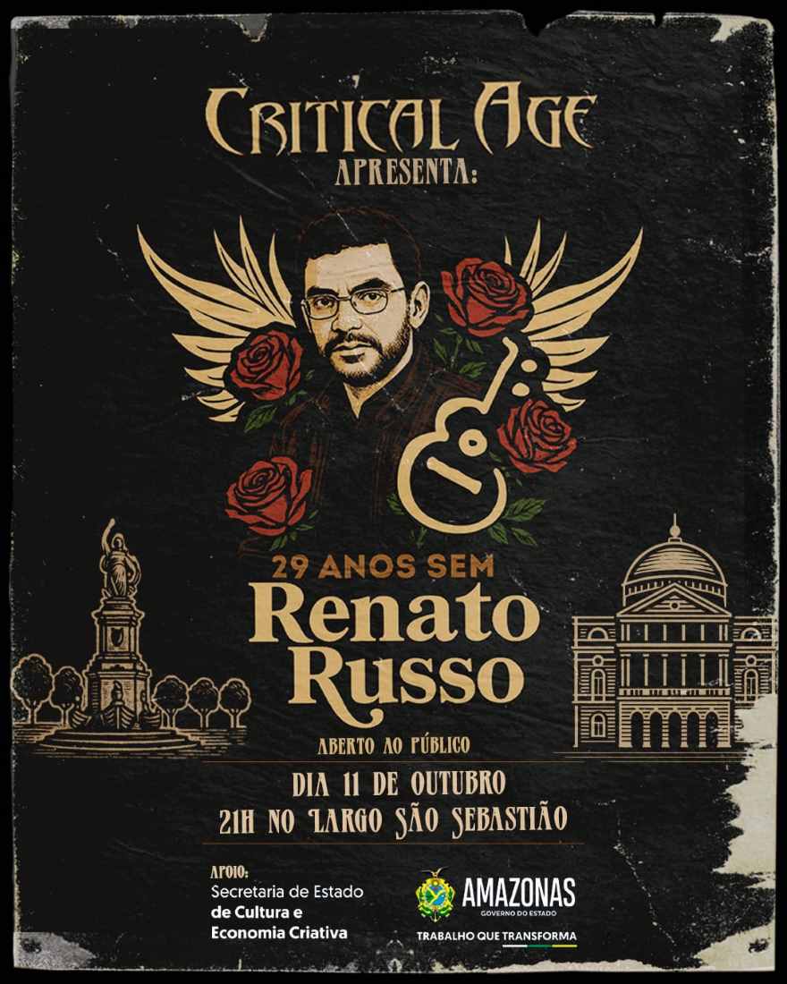 Com o título “29 Anos Sem Renato Russo”, a banda amazonense Critical Age faz show em homenagem a banda Legião Urbana e ao poeta do rock nacional, Renato Russo, no dia 11 de outubro, sábado, no Largo de São Sebastião, às 21h.