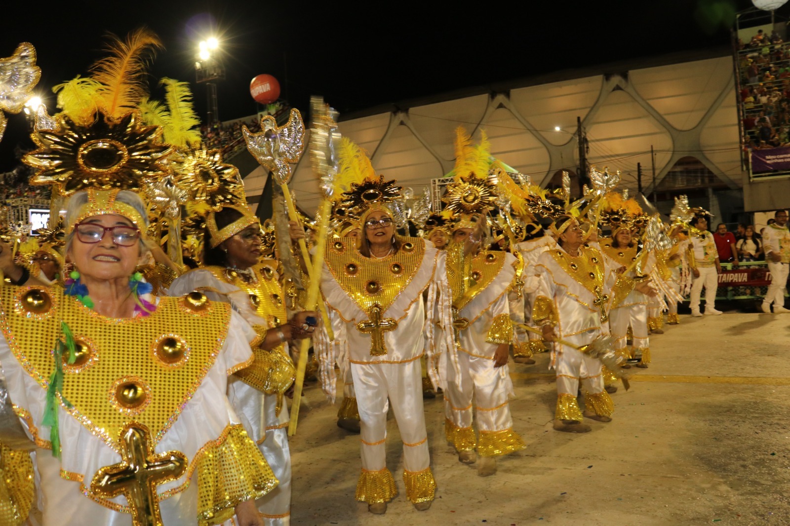 Com enredo que homenageou a trajetória do artista Zezinho Corrêa, o grupo desfilou na ala “A força e o poder da fé”, responsável por retratar a religiosidade do cantor amazonense.