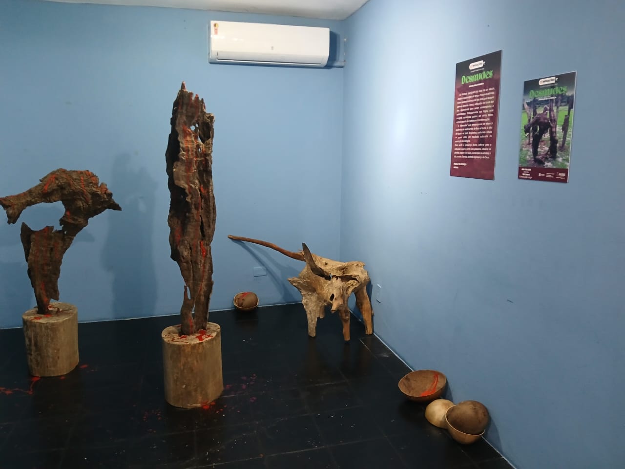 Na instalação “Desnudes”, Paulo Olivença reflete sobre a tensão entre a natureza e o avanço tecnológico. A partir de troncos e vídeos gravados na floresta, o artista constrói uma narrativa sobre a coexistência e o conflito entre o ambiente natural e a “revolução tecnológica sufocante”.