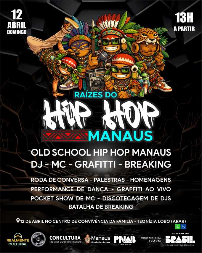 O “Raízes do Hip Hop Manaus” é um projeto contemplado no Edital de Chamamento Público Nº 004/2024, da Política Nacional Aldir Blanc (PNAB), através do Concultura, Manaus e Ministério da Cultura.