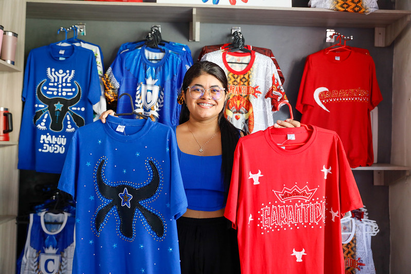 Perto do Bumbódromo, Glenda Azevedo vende, junto com a mãe, comercializa blusas do Caprichoso e Garantido, confeccionadas no ateliê delas. Há dois anos, elas resolveram montar a loja mais perto do local da festa, com o objetivo de atrair mais clientes.