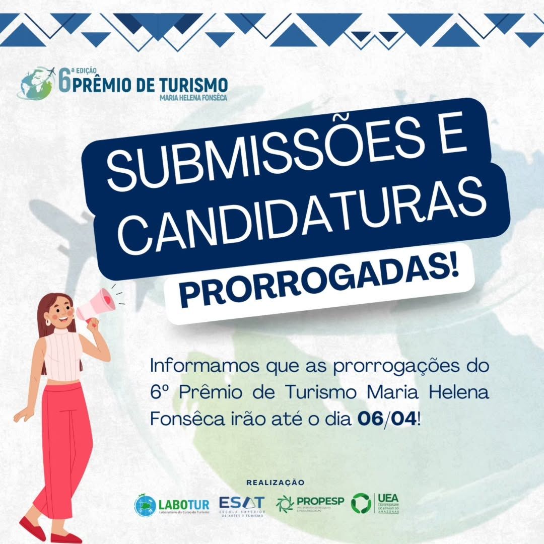 O Laboratório de Turismo da Universidade do Estado do Amazonas (Labotur/UEA) prorrogou as submissões das propostas do edital “Ideias e soluções para o setor do turismo” e as candidaturas da premiação aos profissionais de turismo da 6ª edição do Prêmio de Turismo Maria Helena Fônseca. O novo prazo segue até 6 de abril.
