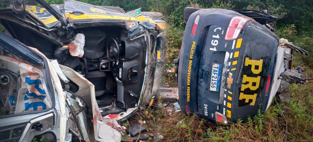 Ainda de acordo com a corporação, o acidente ocorreu “durante uma ocorrência de perseguição”. Uma imagem registrada no local mostra a viatura destruída, fora da pista, em uma área de vegetação às margens da rodovia. O veículo aparece com a lataria retorcida e o teto parcialmente esmagado. Partes da estrutura foram arrancadas, e o interior da viatura ficou exposto.