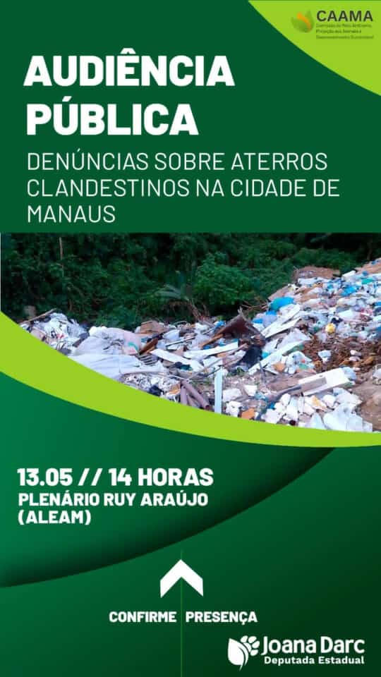 A Comissão de Meio Ambiente, Proteção aos Animais e Desenvolvimento Sustentável da Assembleia Legislativa do Estado do Amazonas (CAAMA/Aleam), presidida pela Deputada Estadual Joana Darc (PR), promoverá Audiência Pública para debater as denúncias feitas pela deputada em tribuna sobre aterros sanitários clandestinos no perímetro da cidade de Manaus nessa segunda-feira, 13.05.