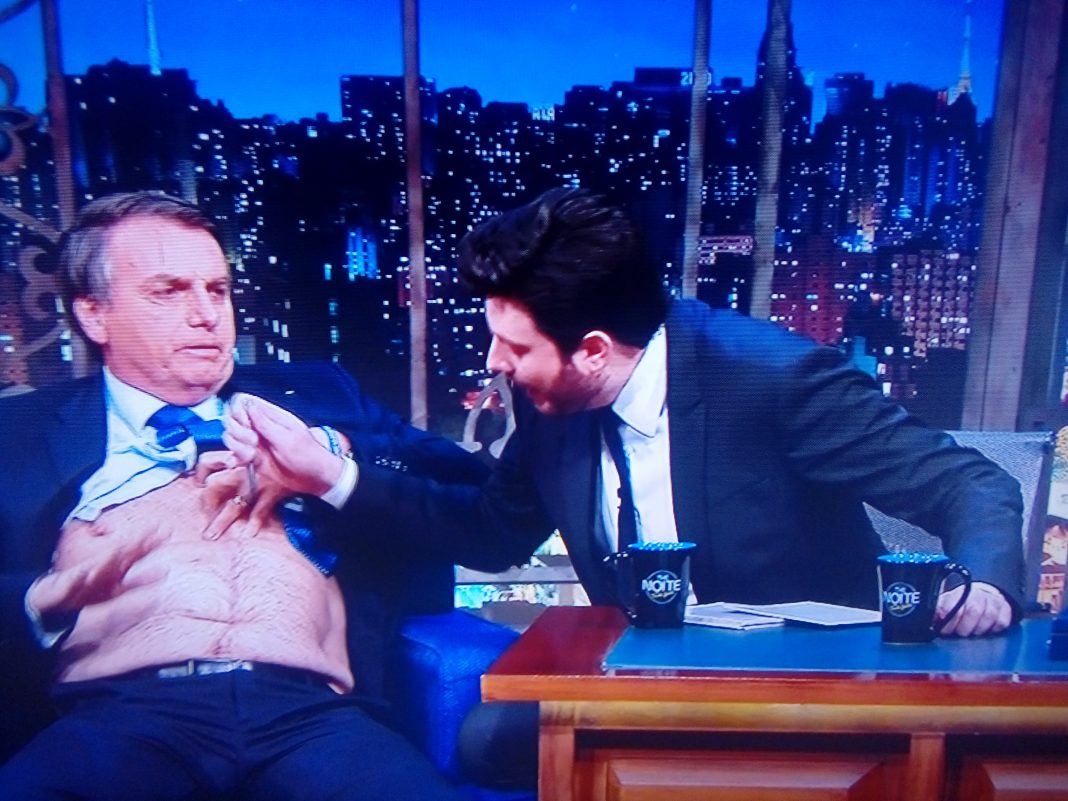 Em entrevista no programa The Noite, que passa nesse momento (00:20h de Manaus) no SBT o presidente Jair Bolsonaro, emocionado, fala da facada que recebeu e mostra a cicatriz para todo Brasil ver.