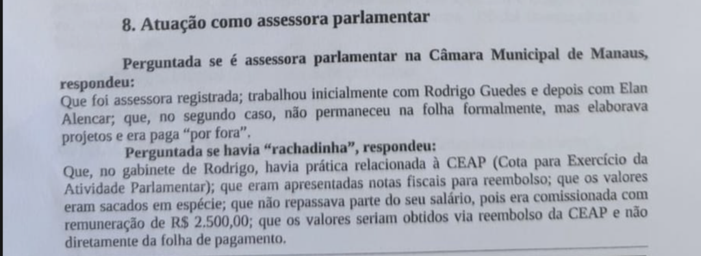 O ponto central da denúncia apresentada por Guedes foca na fala da depoente sobre o período em que trabalhou para Elan Alencar. Segundo o depoimento lido pelo parlamentar, a investigada teria afirmado que, enquanto atuava com o vereador da base governista, recebia um valor de R$ 2.000,00 “por fora” do salário oficial. O montante, conforme o relato, seria entregue em mãos, em espécie, por um intermediário ligado ao gabinete. A denúncia levanta suspeitas sobre a suposta prática de “rachadinha” ou uso irregular de recursos na cota parlamentar.
