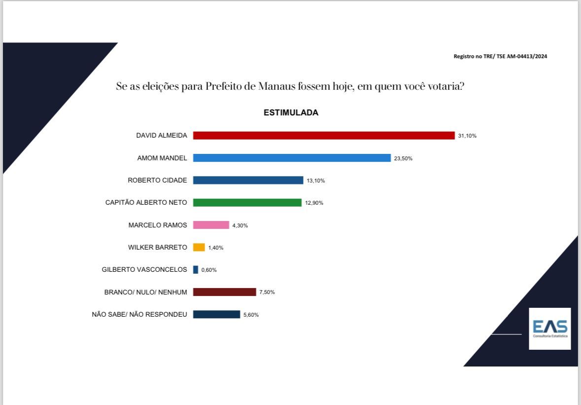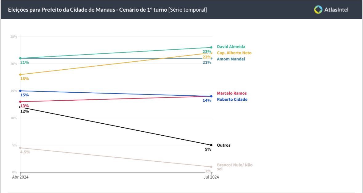 Enquanto Alberto Neto cresce nas pesquisas, outros candidatos apresentaram queda nas intenções de votos, como Amom Mandel (Cidadania) e Marcelo Ramos (PT). [Veja dados da pesquisa AtlasIntel]