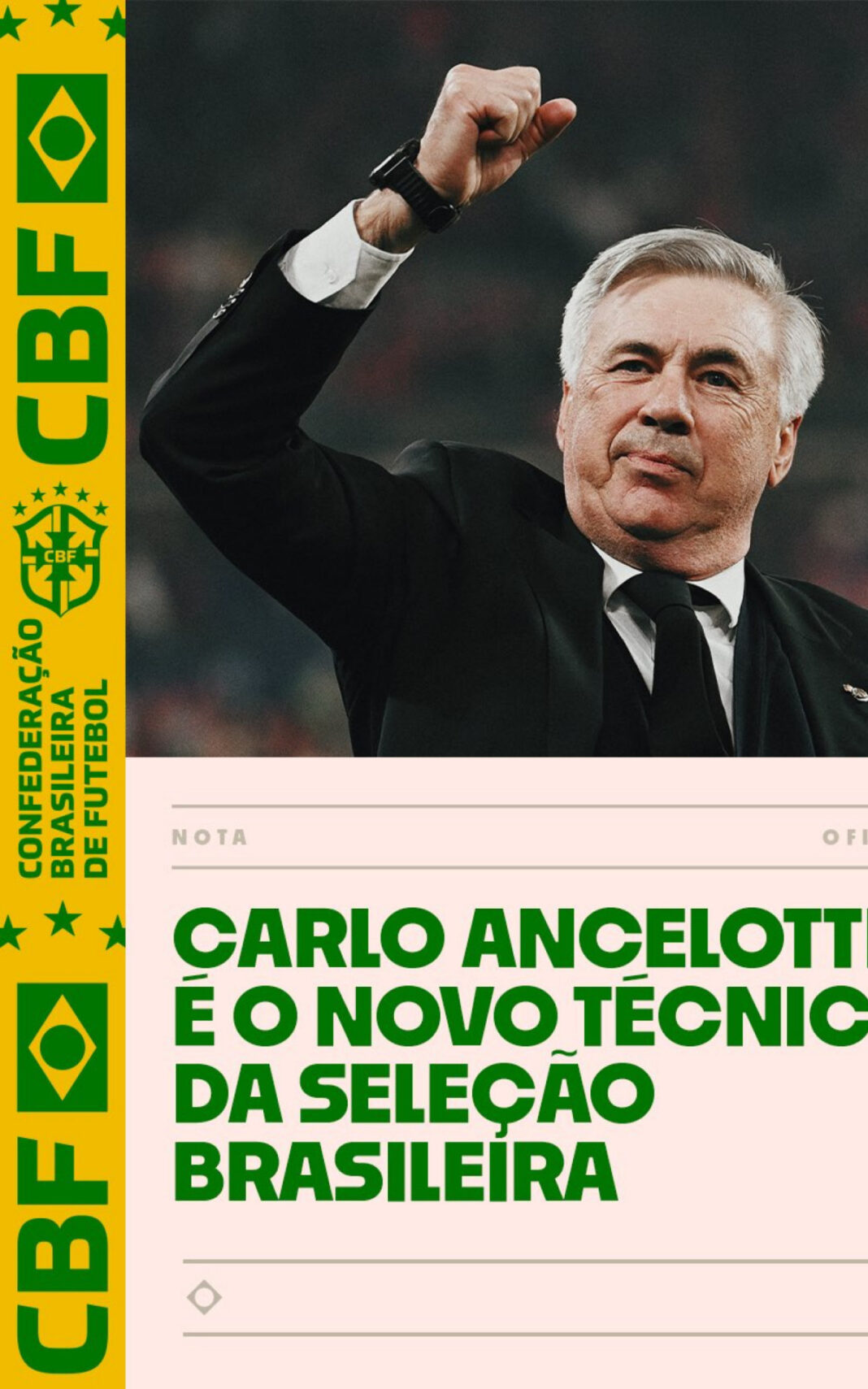 “Trazer Carlo Ancelotti para comandar o Brasil é mais do que um movimento estratégico. É uma declaração ao mundo de que estamos determinados a recuperar o lugar mais alto do pódio. Ele é o maior técnico da história e, agora, está à frente da maior seleção do planeta. Juntos, escreveremos novos capítulos gloriosos do futebol brasileiro”, afirmou Ednaldo Rodrigues, presidente da CBF.