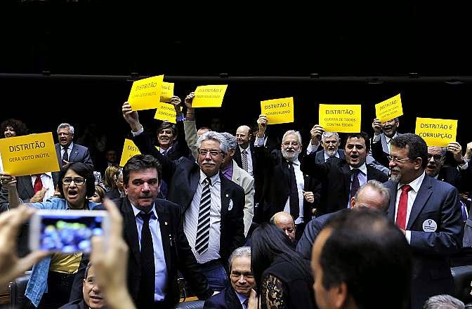 Deputados levantaram cartazes em protesto contra o “distritão”