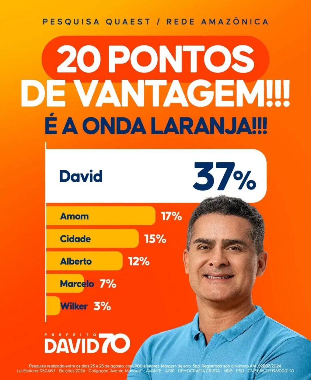 Os números são da pesquisa Quaest, divulgados nesta segunda-feira, dia 26.No cenário estimulado, David aparece com 37% das intenções de voto contra 17% do candidato Amom Mandel (Cidadania).Quando comparado com o estudo divulgado pela mesma Quaest no dia 1 de agosto, ou seja menos de um mês, David cresceu 4 pontos percentuais (de 33% para 37%) enquanto Amom caiu 5 pontos percentuais (de 22% para 17%).Os outros candidatos que aparecem na sequência são: Roberto Cidade (União) com 15%; Alberto Neto (PL), 12%; Marcelo Ramos (PT), 7% e Wilker Barreto (MOB), 3%._Espontânea_A Quaest também ouviu eleitores sobre intenção de votos espontânea, em que os nomes dos candidatos não são apresentados.