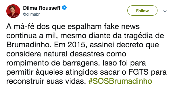 Dilma Rousseff usou o Twitter neste sábado para dizer que em 2015 “assinei decreto que considera natural desastres como rompimento de barragens”.