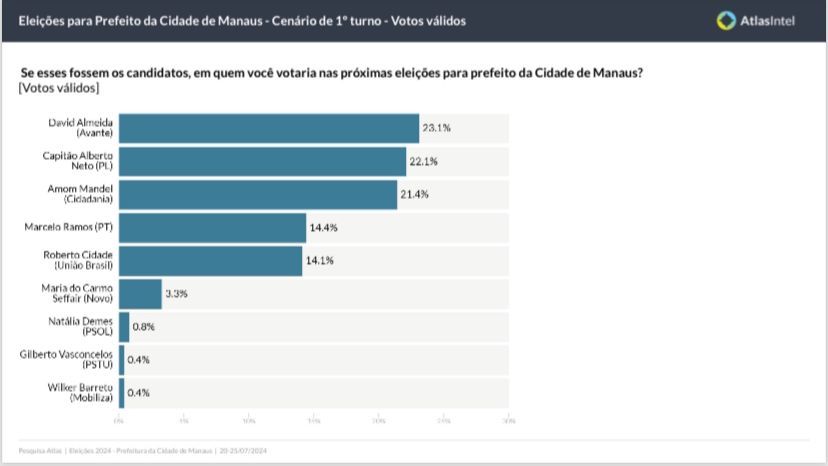 No primeiro turno, o levantamento aponta a permanência do atual prefeito David Almeida (Avante) como primeiro colocado, com 23.1% das intenções de votos válidos, mas mostra a mudança do eleitorado ao colocar o Capitão Alberto Neto em segundo lugar, com 22.1% dos votos válidos, desbancando o também deputado federal Amom Mandel (Cidadania), que aparece em terceiro lugar, com 21.4% das intenções de votos.