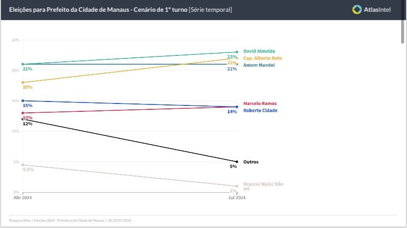 Foi divulgada neste sábado, 27/7, uma pesquisa de intenção de votos da AtlasIntel para as eleições municipais deste ano que mostra uma virada no cenário eleitoral. O deputado federal e pré-candidato a prefeito Capitão Alberto Neto (PL) consolidado no segundo turno após a união com Maria do Carmo do Novo.
