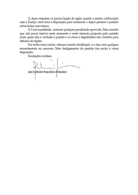 No documento de quatro páginas, Palocci, que negocia acordo de delação premiado com o Ministério Público Federal, reiterou as acusações feitas em depoimento ao juiz Sérgio Moro no dia 13 deste mês e ainda sugere que o PT firme um acordo de leniência “reconhecendo as graves falhas e enfrentando a verdade”.