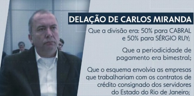 Miranda diz ainda que o dinheiro era dividido entre Sérgio Cabral e Sérgio Ruy, metade para cada um, e que os pagamentos eram a cada dois meses e envolviam as empresas que faziam empréstimos consignados com servidores do estado.