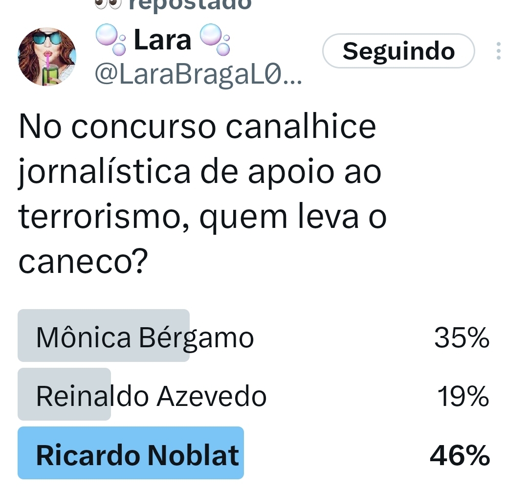Uma enquente que circula na Rede Social X, antigo Twitter perguntou qual o “jornalista e emissora” mais canalha do Brasil e que apoia o terrorismo do Hamas. As opções do jornalismo foram Mônica Bérgano, Reinaldo Azevedo e Noblat, ambos defensores extremos do presidente Luís Inácio Lula da Silva, o ex-presidiário e agora inocente pelo STF.