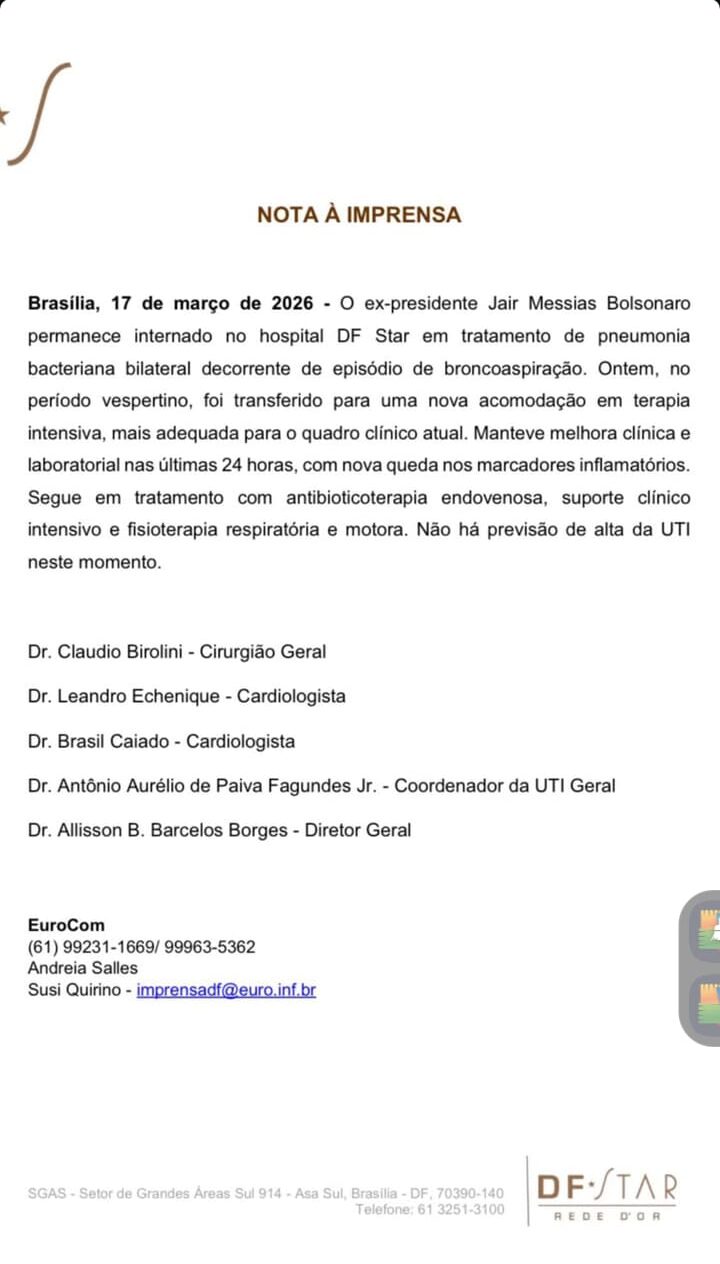 Brasília, 17 de março de 2026 – O ex-presidente Jair Messias Bolsonaro permanece internado no hospital DF Star, em Brasília, para o tratamento de uma pneumonia bacteriana bilateral. O quadro clínico decorre de um episódio de broncoaspiração.