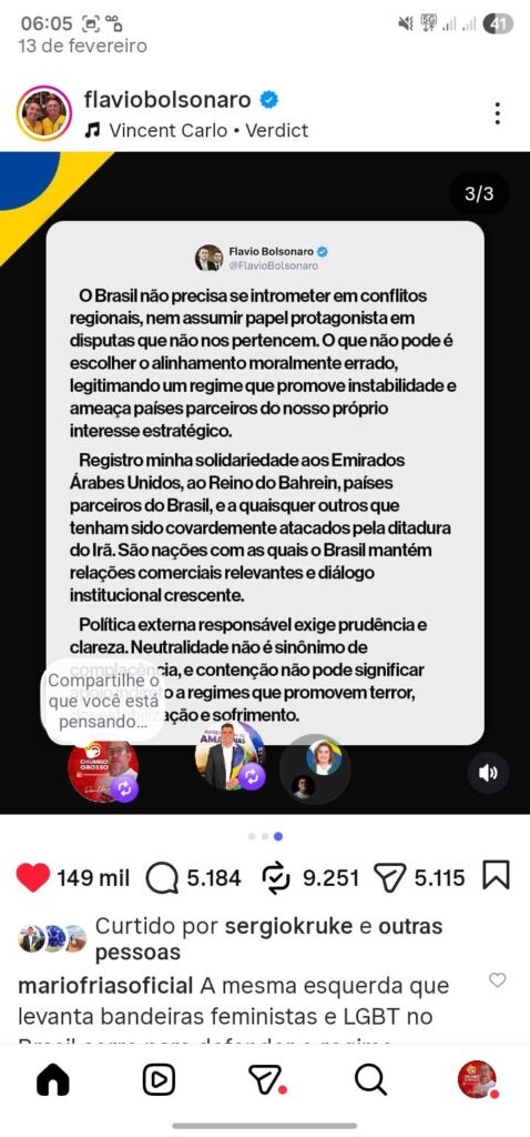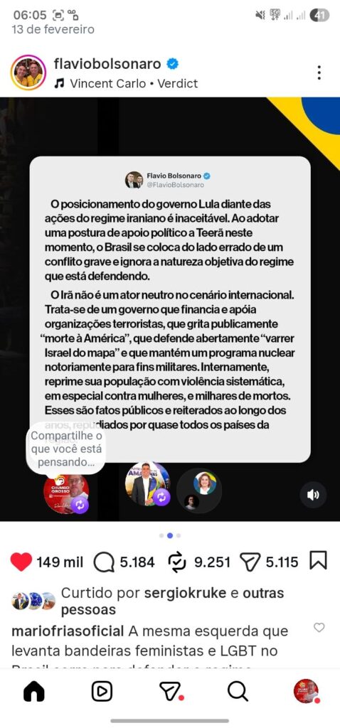 BRASÍLIA – O senador Flávio Bolsonaro (PL-RJ) publicou uma nota oficial em suas redes sociais criticando duramente o posicionamento do governo Lula em relação ao regime iraniano. No comunicado, o parlamentar classifica como “inaceitável” a postura de apoio político a Teerã, afirmando que o Brasil se coloca do “lado errado de um conflito grave”.