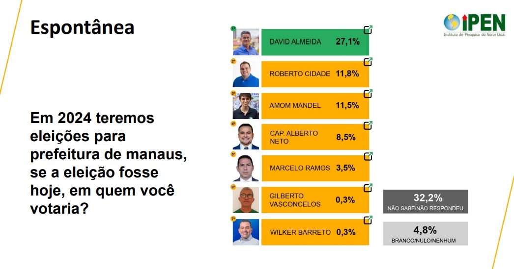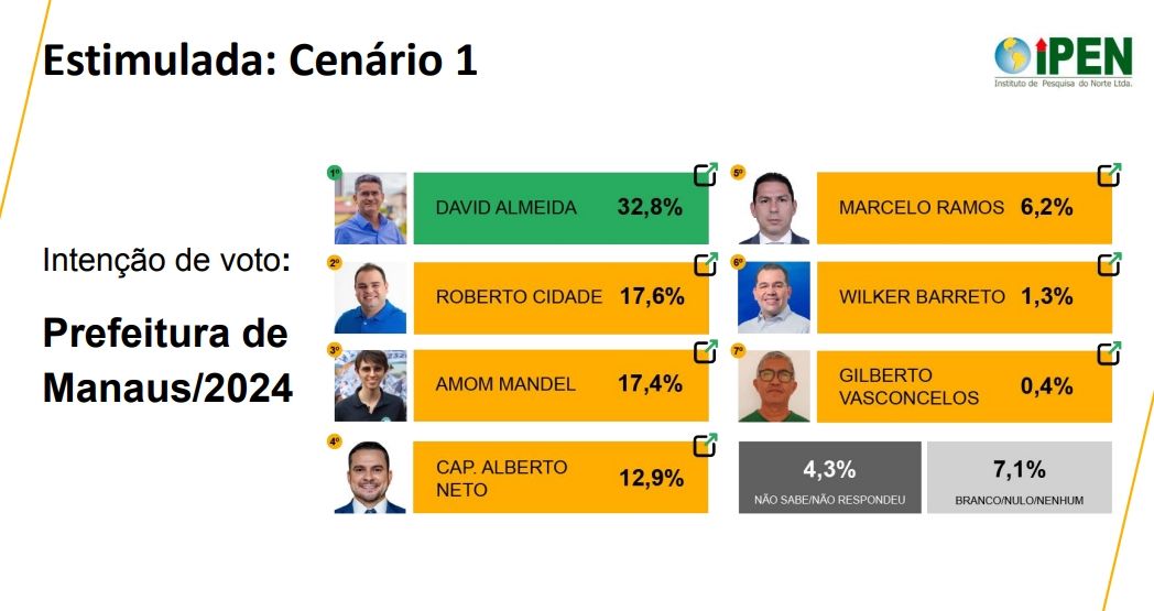 Pesquisa do Ipen (Instituto de Pesquisa do Norte) divulgada nesta segunda-feira (23) mostra o prefeito David Almeida (Avante), que disputa a reeleição, com 32,8% da intenção de votos. O levantamento também mostra que o deputado estadual Roberto Cidade (União Brasil) ultrapassou o deputado federal Amom Mandel (Cidadania).