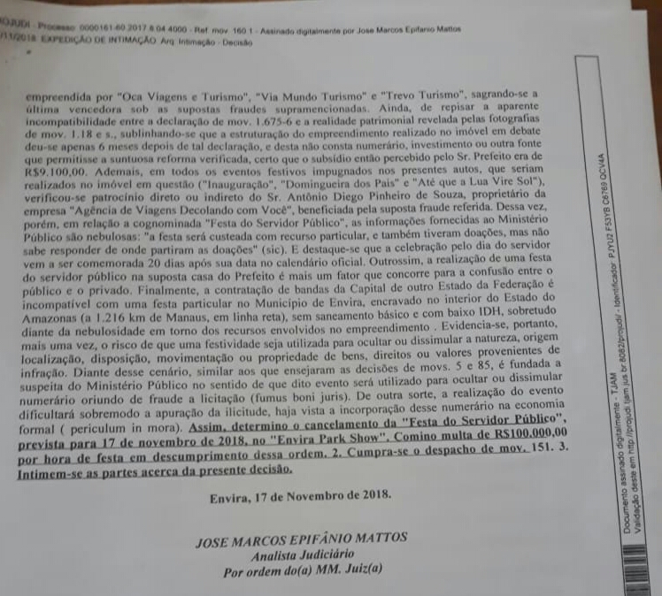 Segundo registra o titular da PJENV, Promotor de Justiça Kleyson Nascimento Barroso, em 2013, o Governo do Estado do Amazonas, por intermédio da Secretaria de Estado de Infraestrutura (Seinfra), firmou convênio com o Município de Envira, no valor total de R$ 11.877.300,14, havendo sido repassados para a municipalidade R$ 6.903.567,18. Já em 2018, dentro de um novo pacote de obras que contemplou todos os municípios do Estado do Amazonas, à exceção da Capital, a Seinfra destinou ao Município de Envira R$ 2.943.242,33 para a realização de serviços de pavimentação e recuperação do sistema viário de Envira, contemplando 95 ruas e logradouros públicos.
