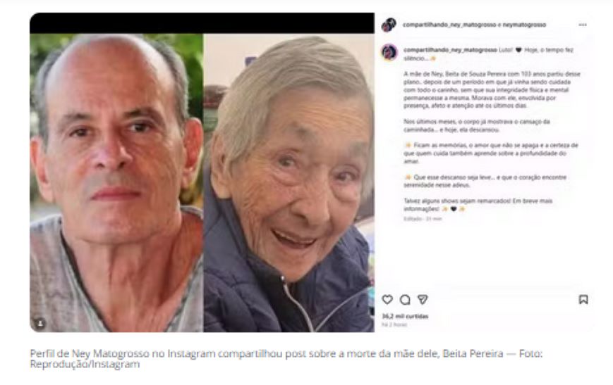 O cantor compartilhou nas redes sociais uma mensagem de despedida. “Nos últimos meses, o corpo já mostrava o cansaço da caminhada… e hoje, ela descansou. Ficam as memórias, o amor que não se apaga e a certeza de que quem cuida também aprende sobre a profundidade do amar”, disse Ney.