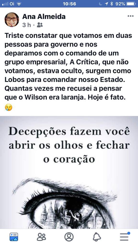 Desesperada e fazendo acusações levianas em sua rede social a mãe do vice-governador Carlos Almeida deixa a relação de seu filho comprometida com Wilson Lima.