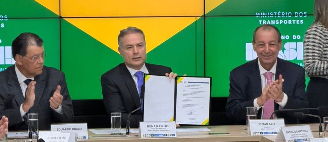 O senador Omar Aziz participou, em Brasília, do ato de assinatura para a licitação que vai contratar a empresa responsável pela recuperação do chamado “trecho do meio” da BR-319 — uma das obras mais aguardadas pela população do Amazonas.
