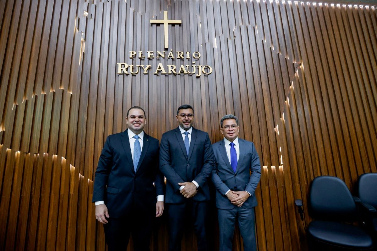 Governador Wilson Lima, entre o vice-governador Tadeu de Souza e o presidente da Aleam, Roberto Cidade