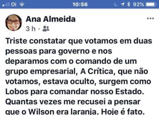 Desesperada e fazendo acusações levianas em sua rede social a mãe do vice-governador Carlos Almeida deixa a relação de seu filho comprometida com Wilson...