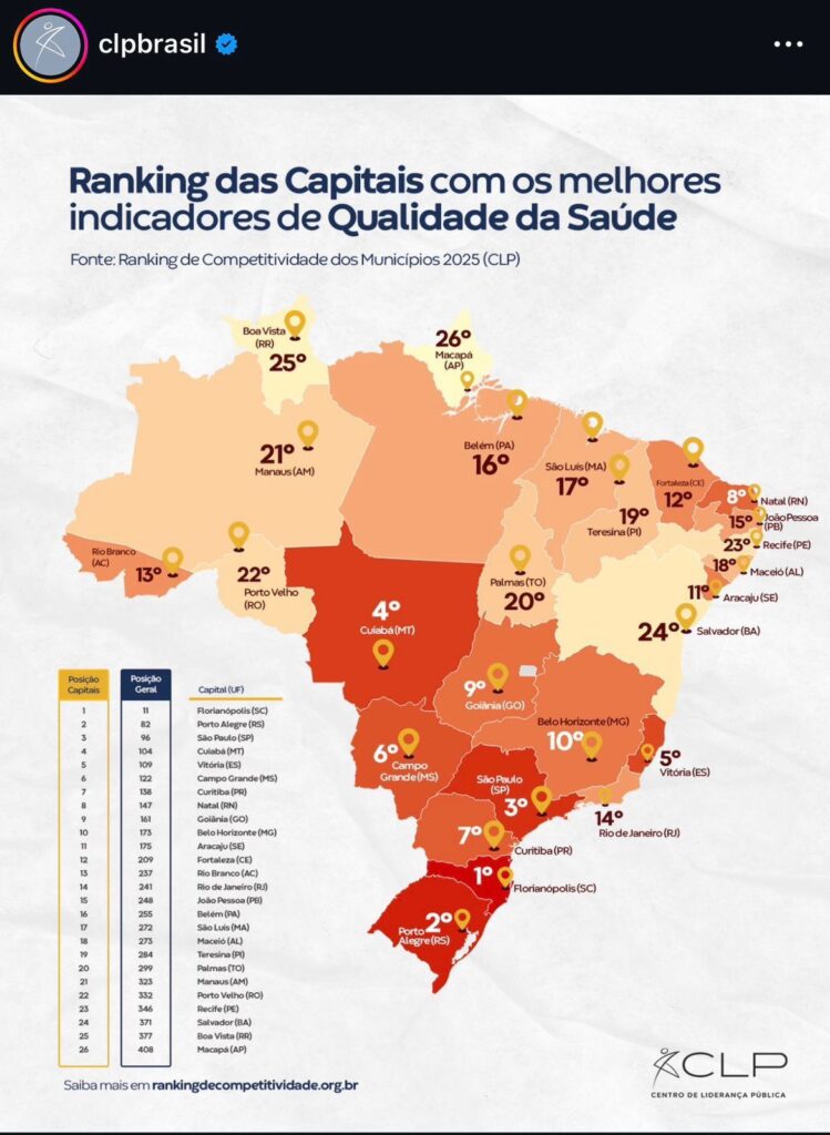 Nesta sexta-feira, 30/1, o Centro de Liderança Pública (CLP) divulgou um novo dado do seu estudo “Ranking de Competitividade”, que avalia tantos os estados como os municípios sobre diversas estimativas de gestão e qualidade de vida. Manaus ficou em 21° lugar, entre as 26 capitais com os melhores indicadores de qualidade de saúde.