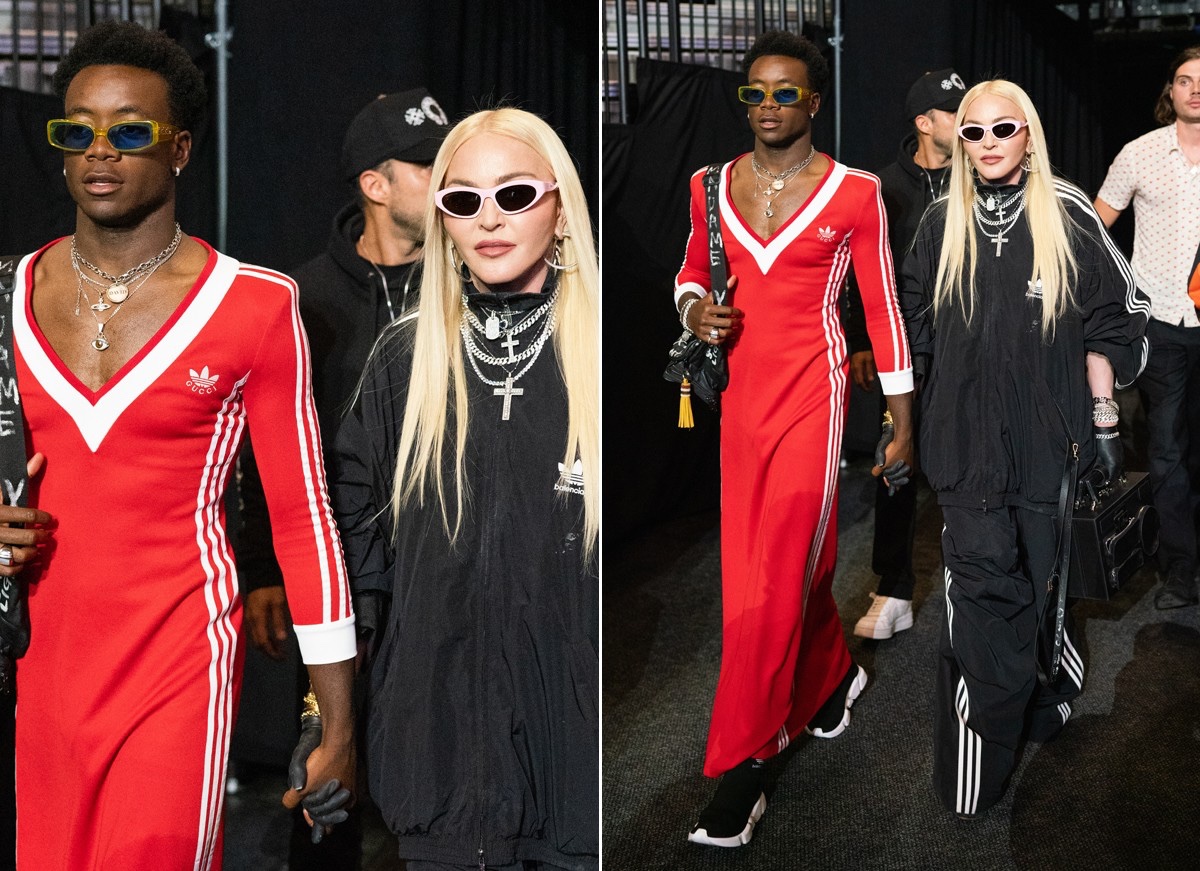 Madonna, que também usava um look confortável da primeira grife, acompanhou o filho usando óculos escuros e correntes. David também usava acessórios brilhantes, tênis e uma bolsa à tiracolo.