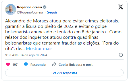 A postura de Alexandre de Moraes também recebeu apoio de algumas personalidades políticas. O deputado Rogério Correia, vice-líder do governo na Câmara, declarou que “Alexandre de Moraes atuou para evitar crimes eleitorais, garantir a lisura do pleito de 2022 e evitar o golpe bolsonarista anunciado e tentado em 8 de janeiro”.