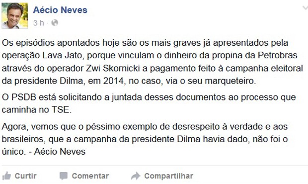 “O PSDB está solicitando a juntada desses documentos ao processo que caminha no TSE. Agora, vemos que o péssimo exemplo de desrespeito à verdade e aos brasileiros, que a campanha da presidente Dilma havia dado, não foi o único”, diz publicação de Aécio no Facebook. Na nota, o senador também chama classifica os episódios revelados nesta segunda-feira como “graves”.