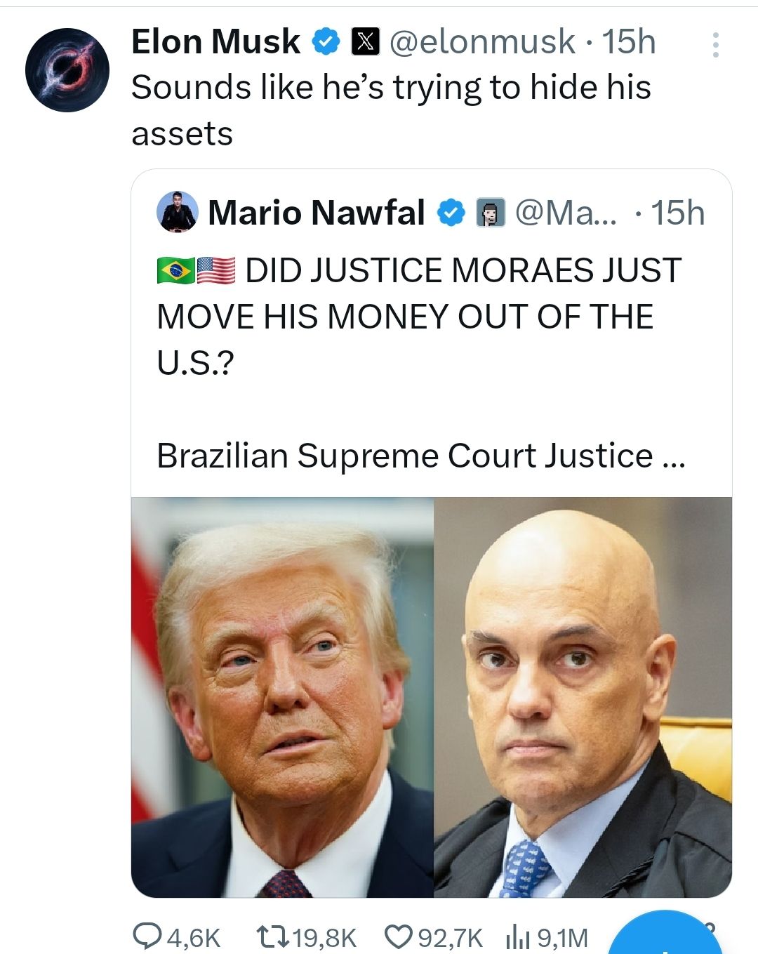O juiz da Suprema Corte brasileira, Alexandre de Moraes, supostamente retirou todos os seus bens dos Estados Unidos. A postagem foi compartilhada por Elon Musk e Mário Nawfal.