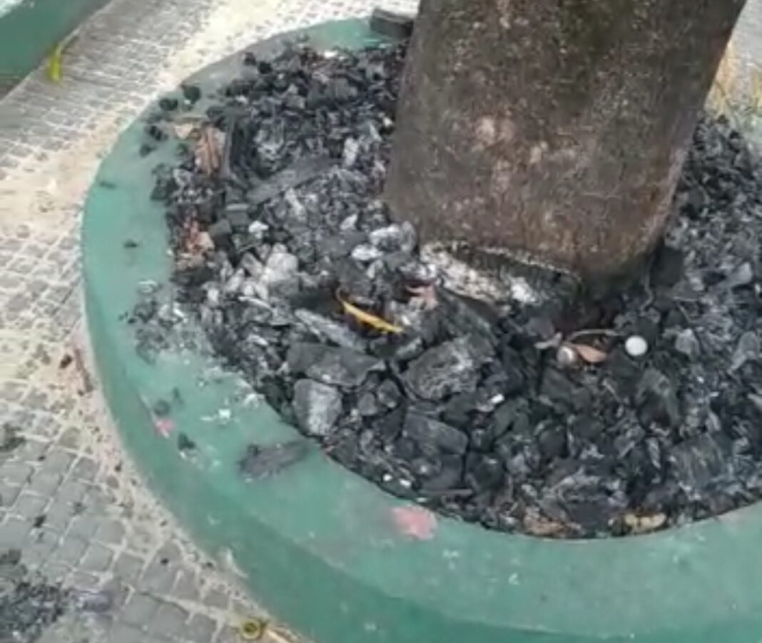 Segundo denúncia um permissionários que vende churrasco usa a praça das crianças para colocar mesa e de quebra joga restos de carvão para matar as mangueiras.