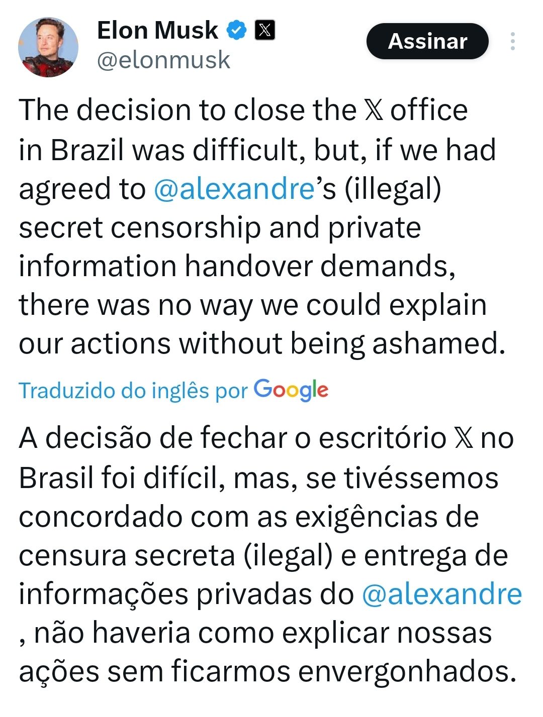 A Conta Global Government Affairs do X anunciou neste sábado (17/8) que o X, antigo Twitter, encerrou suas operações no Brasil, com efeito imediato. No perfil oficial da rede, a responsabilidade do fechamento é atribuída ao ministro Alexandre de Moraes, do Supremo Tribunal Federal (STF).