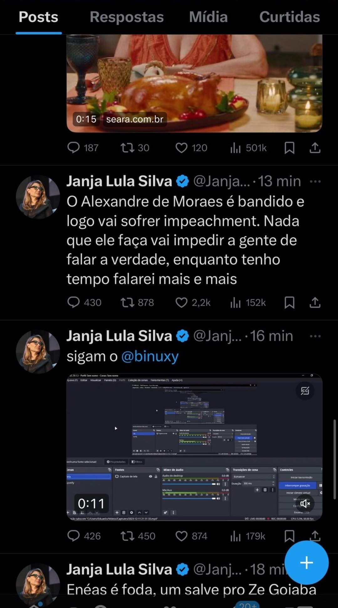 Dentre as publicações falsas, que começaram às 21h37 e incluem cunho sexual, há frases como “Eu apoio o mensalão” e “Alexandre de Moraes é bandido”, em referência ao ministro do Supremo Tribunal Federal (STF) e presidente do Tribunal Superior Eleitoral (TSE), veja;