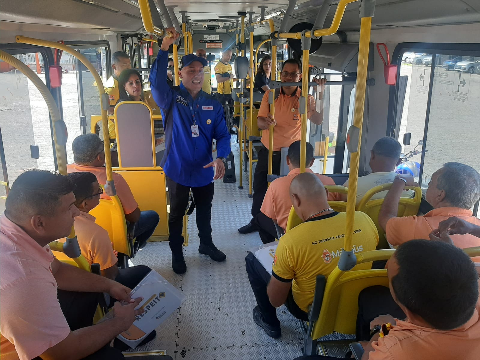 Após o trabalho de ponto cego, os instrutores fazem um bate-papo com os motoristas de ônibus que participam da atividade do Maio Amarelo, como forma de ampliar o conhecimento em relação à prevenção de acidentes no trânsito.