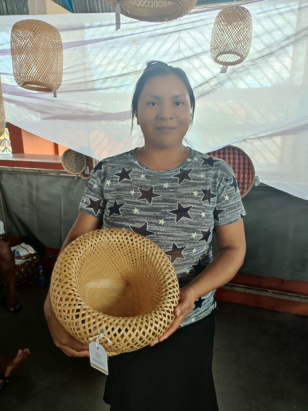 A artesã Claudiane Santos e Silva, 32, pertence à etnia Baniwa e integra o grupo de expositores da feira com luminárias, cestarias, balaios e urutu com a técnica de traçado de fibra de Arumã.