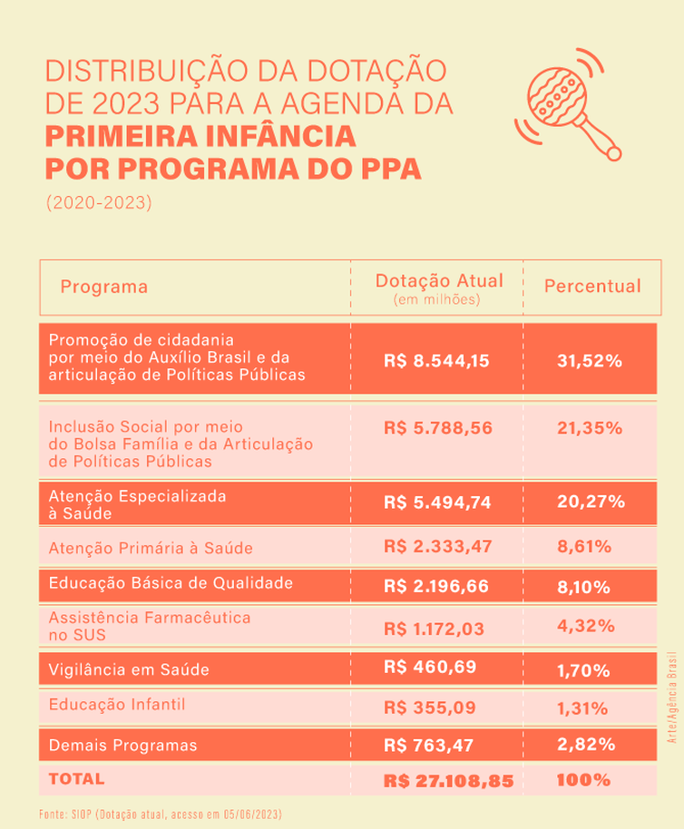 Após anos de estrangulamento, o orçamento das ações para a primeira infância (crianças de até 6 anos) foi ampliado em 2023. Segundo relatório repassado com exclusividade para a Agência Brasil pela Secretaria de Orçamento Federal (SOF) do Ministério do Planejamento, a dotação subiu de R$ 19,606 bilhões no ano passado para R$ 27,109 bilhões neste ano, alta de 38,3%.