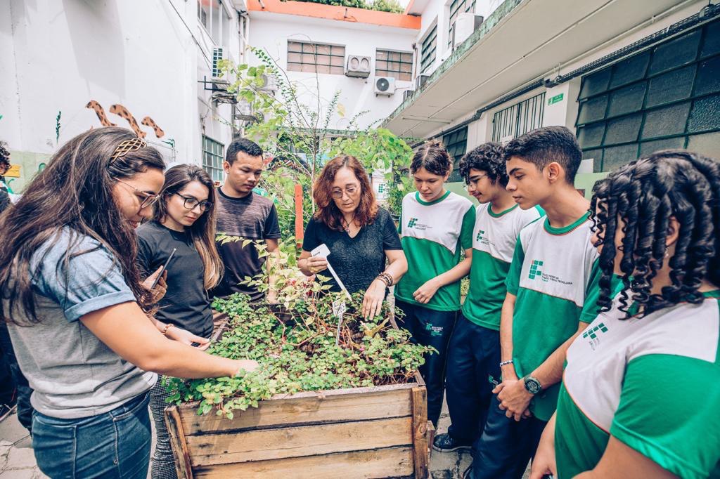 Alunos do ensino médio construíram, por meio de oficinas, um jardim sensorial, no Instituto Federal do Amazonas (Ifam), que conta com 16 canteiros e uma grande diversidade de espécies vegetais, que estimulam o tato, o olfato, o paladar e a visão.