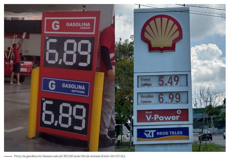 MANAUS – O preço do litro da gasolina comum caiu entre R$ 0,10 e R$ 0,20 nos postos de combustíveis em Manaus. O ATUAL constatou, desde a noite de quinta-feira (10) a redução do preço. O litro baixou de R$ 7,09 para R$ 6,99 na maioria dos postos, mas alguns reduziram para R$ 6,89. Outros postos ainda mantém o preço antigo neste sábado (12).