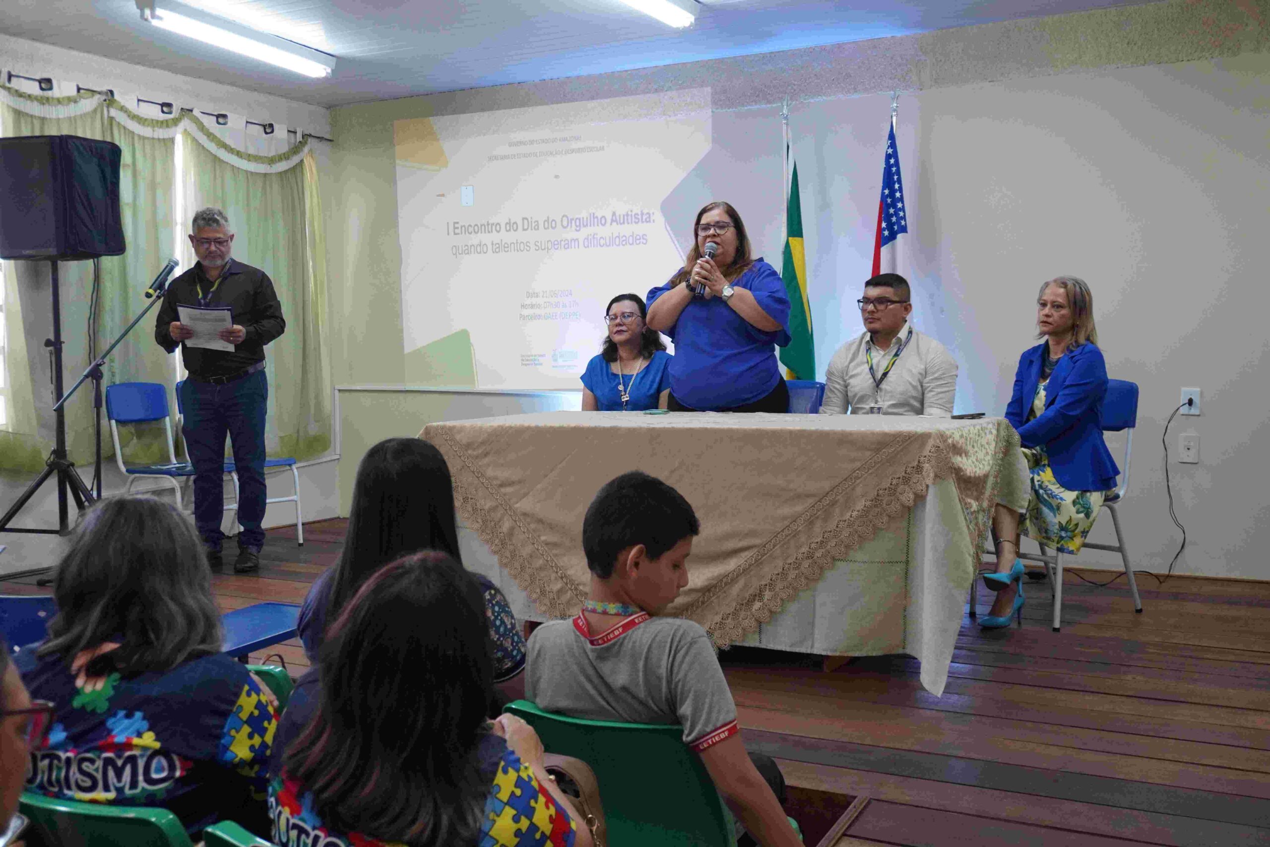 Professores e alunos da rede estadual se reuniram, nesta sexta-feira (21/06), no “1° Encontro do Dia do Orgulho Autista: quando talentos superam dificuldades”, que ocorreu na Escola Estadual de Atendimento Específico (EEAE) Mayara Redman Abdel Aziz, na zona centro-sul de Manaus. O evento foi coordenado pela Secretaria de Estado de Educação e Desporto Escolar e contou com transmissão do Centro de Mídias de Educação do Amazonas (Cemeam).