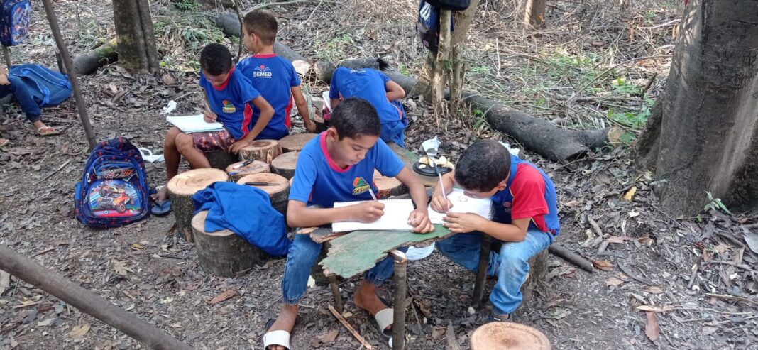 Foi com esses ensinamentos que ele e seus alunos criaram o “Jogo da Floresta – O que nos oferece a floresta”, uma atividade realizada ao ar livre, com um percurso montado a partir de toras de madeira numeradas e com imagens de animais da região. Divididos em grupos, os estudantes avançam conforme as instruções sorteadas, aprendendo sobre os benefícios da floresta em pé, o trabalho coletivo e conceitos relacionados às Reservas de Desenvolvimento Sustentável (RDS) e às Áreas de Proteção Ambiental (APA).